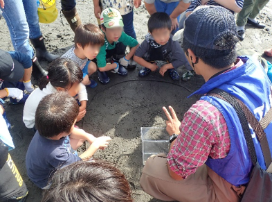 「広い干潟をやみくもに探すのではなく、アサリのすみかを見つけましょう。干潟にはたくさんの穴があいています。このなかでも直径1~2mmの小さな穴に、アサリがいる可能性大! クマデを使って、15cmほどやさしく土を掘り返し、土の中にうもれているアサリを探しましょう」