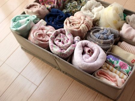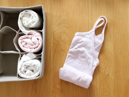 赤ちゃんの肌着やロンパースは、ひもやボタンが多かったり、クロッチ(股下の部分)がついていたり、たたむのが面倒ですが、そんなベビー服もくるくる巻いて立てる収納にすればラクちん♪ スタイなどの小物も、1マスに立てて並べれば、埋もれることなく取り出しやすくなります。