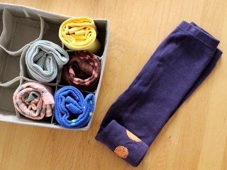 秋冬に欠かせないレギンスやタイツも、縦に2つ折りにしてからくるくる巻いて立てて入れれば、出し入れするときに乱れることなく、選びやすさもバッチリ! 巻いて入れるだけ、と簡単なので、子どもが自分で洗濯物を片づけることもできますよ。