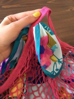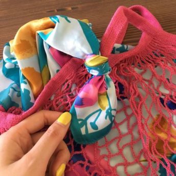 ①スカーフを折ってネットバッグの中に入れます