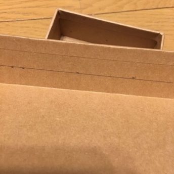 平らに仕上げるため、クラフト引き出しBOXに、セメントを入れる高さ(コースターの底の厚さ)に鉛筆で線を引きます。