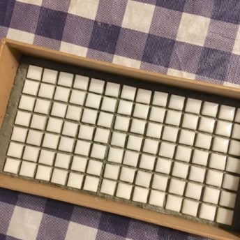 コースターの型となるクラフト引き出しBOXのサイズに合わせてシート状になったタイル(ホームセンターで購入)をカットします。今回は裏にネットがついているタイルを使ったので、ネット部分をハサミでカットします。