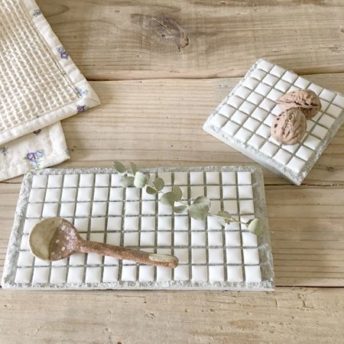 ダイソーで購入したセメントをタイルの目地がわりにして、さわやかなタイルコースターを作ってみました。