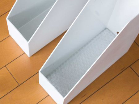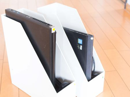 PCを色ごとにスタンドタイプのファイルボックスに収納します。精密機器なので、底に緩衝材を敷きました。