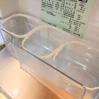 ペットボトルを冷蔵庫のポケットの高さに合わせてカッターナイフでカットし、カットしたふちにマスキングテープを貼り保護します。底が凸凹している場合はフラットになるように底もカットします。
