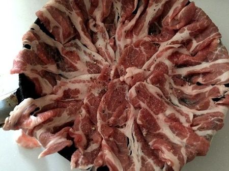 ①直径20㎝くらいのフライパンに、豚バラ肉を1枚1枚、真ん中を重ねながらフライパンのへりにかけるように並べ、軽く塩・こしょうをふります。