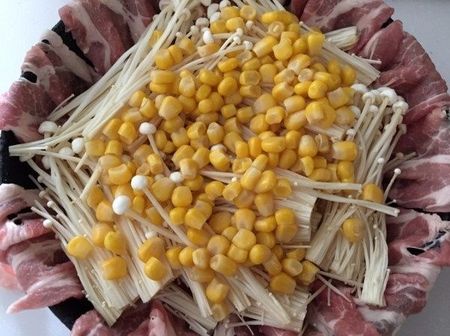 ②えのきだけの根元を切り、コーンとともに肉の上にのせ、バターをちぎって散らします。