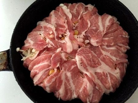 ぱっと見、餃子にも見えますが豚バラ肉です。20㎝くらいの小さめのフライパンに豚バラ肉を並べ、えのきだけと缶詰のコーンとバターを散らし、肉で包んで焼きました。カリッカリのお肉の中はバター香るえのきだけとコーン。ポン酢をかけていただきます。