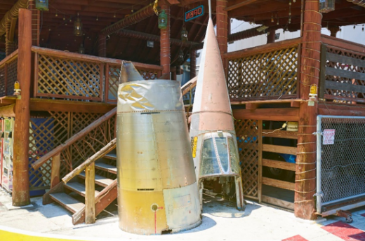 園内や駐車場などいたるところに、戦闘機の部品やアメ車など貴重なものが飾られています。これらもオーナーのコレクション! 「お客さまにいつも新鮮さを感じていただけるよう、定期的に配置を変えたり、壁も塗り直したりと模様替えしています」とのこと。
