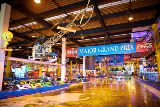 園内でいちばん大きな建物の中には、なんとゴーカート場が! 使用する車も、アメリカから輸入するというこだわりよう。吹き抜けになった天井部分には、映画に出てくるようなガンシューティングやヘリコプターが。ここでは日中でも、まるで夜のような雰囲気の写真を撮ることができます。