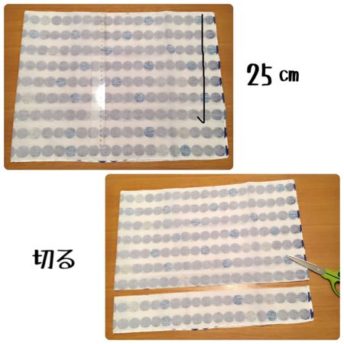 手ぬぐいを半分に折り、端から25㎝のところで写真のように切ります。切るのはこれだけです。もともと縫ってある部分も活用します。