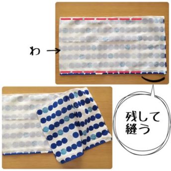 手ぬぐいを中表にし、長さを半分に折り、写真(上)の「残して縫う」の部分13㎝を残して、赤線部分、3つ折りのきわを縫います。写真(下)は縫い終わったところです。