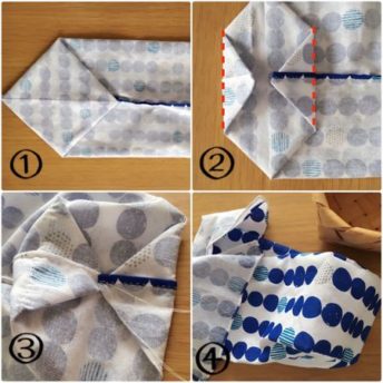 袋状に縫った手ぬぐいの縫い目同士を真ん中で合わせて、底が正方形になるように折りたたみます(写真①)。正確に測らなくても大丈夫です。