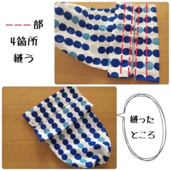 上から13㎝残っている部分を、両脇の縫い止まりの部分までそれぞれ折ります。端は手ぬぐいの端なので、端処理しなくてOKです。赤線部分を4箇所、縫い合わせます(折った端を2本と、半分に折ったところ2本を縫います)。