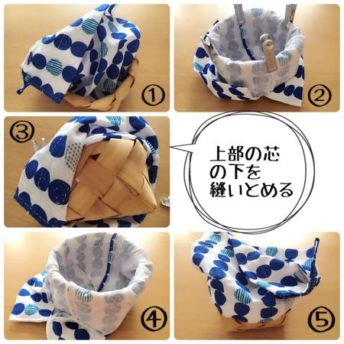 ・使っているセリアのかごは、口は丸ですが底は四角なので、合わせやすいように手ぬぐいの袋にマチを作っておくのがポイントです。