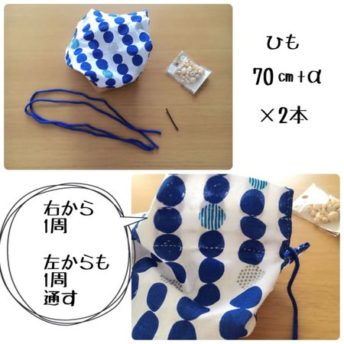 袋の口、縫ってある下側に、右から1周、左からも1周ひもを通します。ひも通しやヘアピンにはさんでおくと通しやすいです(2本とも縫ってある下側に通します)。