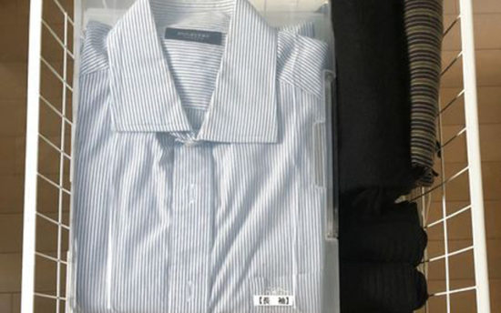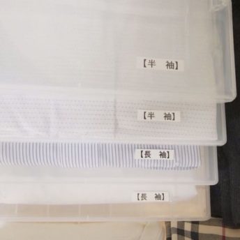 そんな二度手間をなくすために、ワイシャツにアイロンをかけてたたんだら、ファイルケース1個につき1枚ずつ収納します。余計なシワもつかず、重ねることもできます。半そでか長そでかの区別はラベリングでわかるようにします。