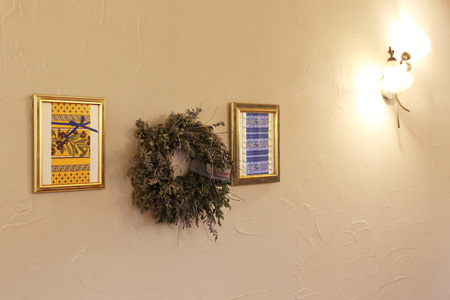 常連さんが描いた美しいポストカードを、奥様がセンスよくディスプレイ。
