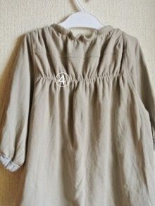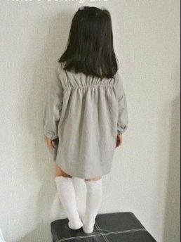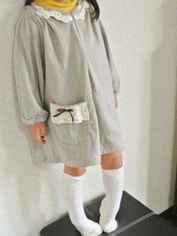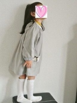 下に着るスモック自体もゆったりしているので、大人服のゆとりをそのまま生かしました。大人服を子ども服にサイズ調整するとき、特にネックになるのは、①首まわりのあき ②そで&着丈の長さ ③身幅 だと思います。