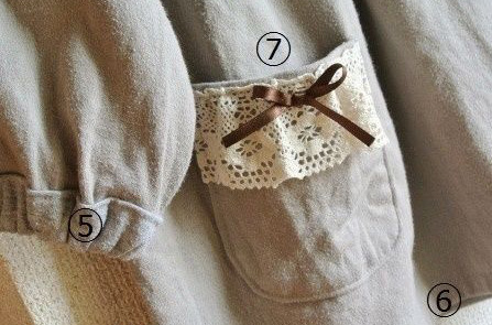 ⑦カットした布で作ったポケットを縫いつけ、飾りにレースとリボンをつけます。