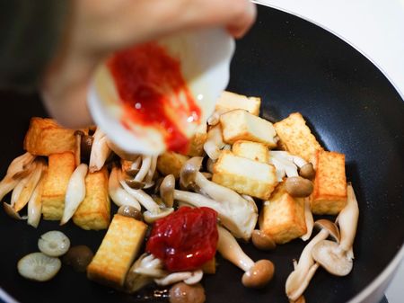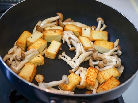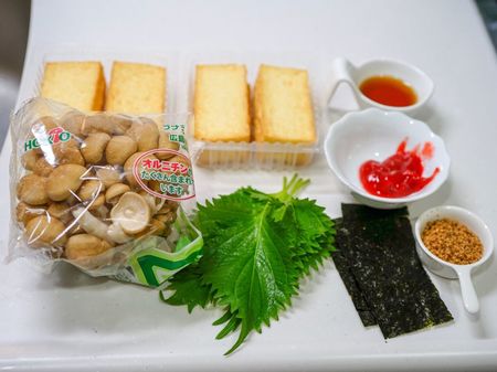 厚揚げは食べやすい大きさ(今回は4等分)にカットしてください。しめじは、根元の石づき部分を包丁でカットし、3本ずつ程度にほぐしておきます。