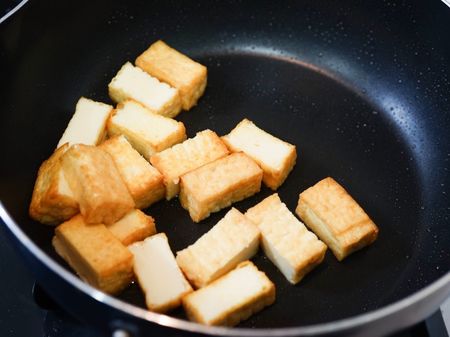 小さじ1杯分のごま油をフライパンに入れて、厚揚げを中火強〜強火くらいの火加減で3~4分炒めます。表面に香ばしそうな焼き色がつくくらいが理想です。