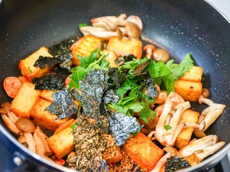 梅肉とごま油がからんだら火を止めます。ちぎった大葉とのり、すりごまを加え、サッと混ぜれば完成です。