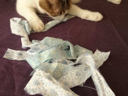 リースのラフな雰囲気を出すために、端切れを手で無造作に裂いてリボン状にします。