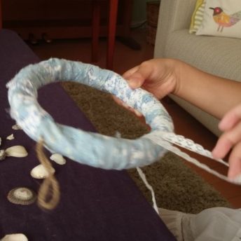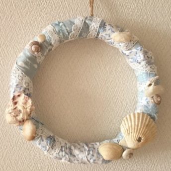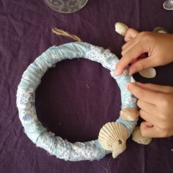 布選びから貝殻の配置、完成したリースを家のどこにレイアウトするかまで、子どもにまかせると、とっても喜びますよ♪