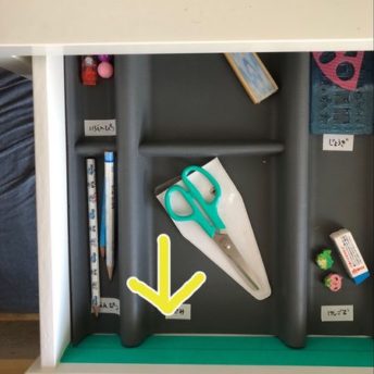 引き出しの内側、鉛筆の先があたりそうな部分にマスキングテープを貼ります! すると、鉛筆を乱暴にしまったり、引き出しを乱暴にあけたりしても、汚れるのはマスキングテープだけ。気になったころに剥がして貼り直せばOK!