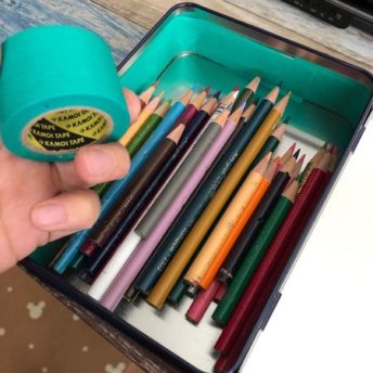 わが家では、リビングで塗り絵をしたり、外出先の暇つぶしに使用したりするときに持ち運びやすいよう、色鉛筆を缶で保管しています。缶の側面にあらかじめマスキングテープを貼っておけば、汚れたときに剥がして貼り直すだけでOK! 一周を一度に貼るのは大変なので、2〜3回に切り分けると貼りやすいです。持ち運ぶ頻度が高ければ、底と天井部分にもどうぞ。