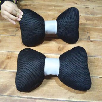 いかかでしょう? ブラックの土台にグレーのフェイクレザーを合わせたことで、落ちついたリボンに仕上がりました。薄いピンクのネッククッションなら、かわいらしいイメージに仕上がると思います。