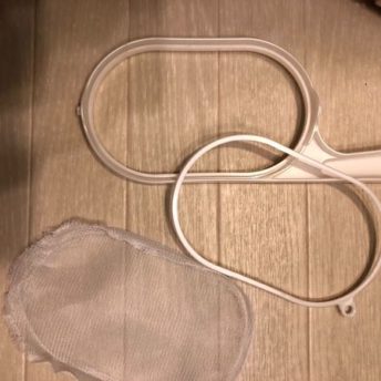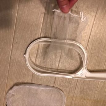 いつも使っている道具のネットを、使いやすいものに交換します。はめ込んであるだけなので、外枠をぱこっとはずし、目のつまったストッキングタイプの排水口ネットをセットします。