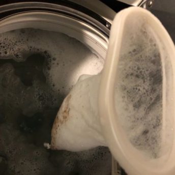 わが家の場合、オキシクリーン(酸素系漂白剤)と60℃のお湯(わが家のシャワーの上限の温度)を前日に洗濯機に入れて少しの間 回転させて放置します。翌朝にはお湯がかなりすごい色になっています。