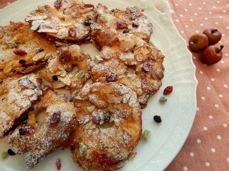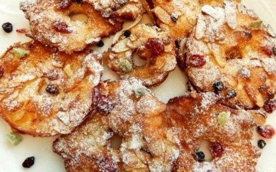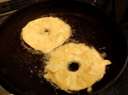 皮つきのまま芯をくりぬき、輪切りにしたりんごはドーナツ型。そんなりんごにスライスアーモンドをつけて、ココナッツオイルで揚げ焼きしたら、りんごドーナツのできあがり。ココナッツオイルの香りがこうばしくて、アーモンドはカリッと、中のりんごはしっとりです。ちょっと変わったリンゴのスイーツです。