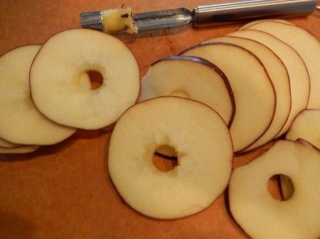 ①りんごは皮つきのまま芯をくりぬき、厚さ5㎜の輪切りにしてレモン汁をふります。