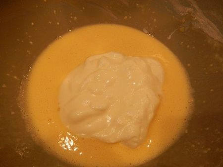 ②卵は卵黄と卵白に分け、卵白は泡立てます。ボウルにホットケーキミックスと牛乳、卵黄を加え、よくかき混ぜます。さらに、泡立てた卵白をざっくりと混ぜ合わせます。
