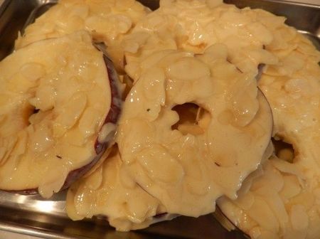 ③りんごに②をつけ、スライスアーモンドを重ならないように全体に散らします。