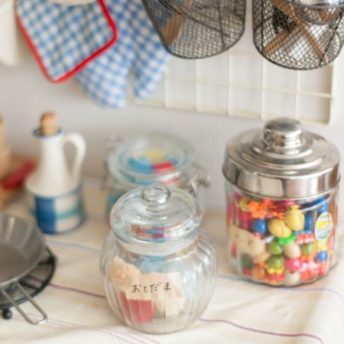 花おはじきやウッドビーズ、お手玉などを食材に見立てガラスポットに入れます。そのほうが見た目もかわいいし、子どもも想像力をかきたてられるようです。季節によっては、拾ってきた木の実などもおままごとの材料にします。