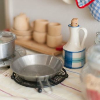 フライパンの下は100円ショップの鍋敷きをコンロに見立てて置いただけ。小瓶は私がもう使わなくなったアンティークのオイル差し。子どもサイズであれば、おままごと専用の用具にはこだわりません。
