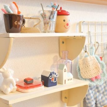 おままごとキッチンの棚の上は、子どもが雑貨屋さんやフリーマーケットなどで見つけた、お気に入りの雑貨を自分でレイアウトしています。いろいろ考えながら飾るのはとても楽しいようです!!