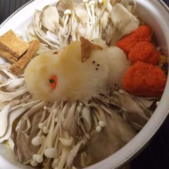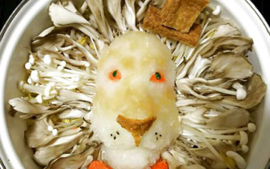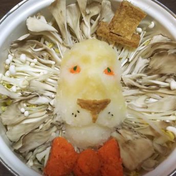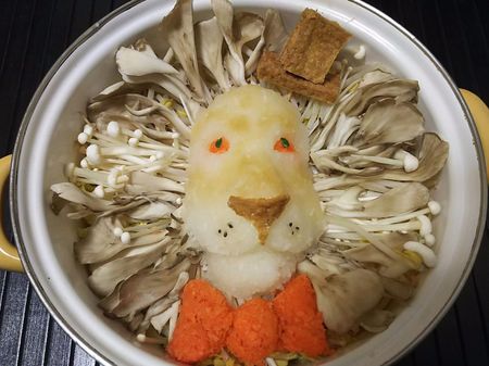 キュートなライオン鍋です。たてがみはたっぷりのきのこ、顔は大根おろし、蝶ネクタイはにんじんおろしで作り、厚揚げで作ったハットをちょこんと添えます。茶系でまとめてアンティークな感じに仕上げました♪