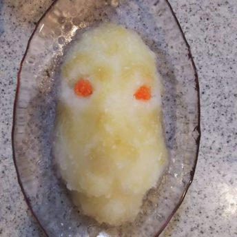 ②だししょうゆで口元以外に色をつけます。目のくぼみににんじんおろしを入れ、目玉にします。