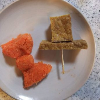 ④にんじんおろしで蝶ネクタイ、厚揚げでハットを作ります。