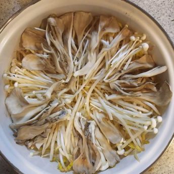 ⑤白菜と豚バラ肉をミルフィーユのように交互に重ねて鍋に入れ、土台を作ります。③で余ったほうれん草を入れてもいいです。その上にきのこをたっぷりのせます。