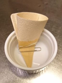 ココット容器やコップなどの器に水をはり、コーヒーフィルターを円すい状に丸めてゼムクリップでとめたものを入れます。器から出た部分が立つように入れるのがポイントです。フィルターが長すぎてくたっとしてしまうと、吸いあがった水がこぼれ落ちてしまいますので注意してください。