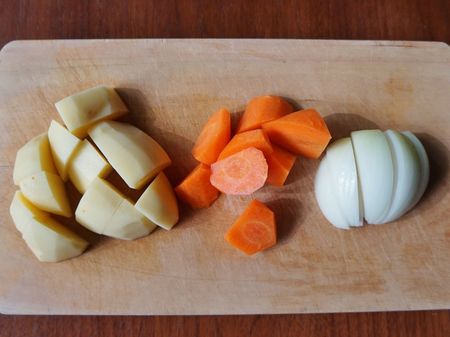 じゃがいもは皮をむいてひと口大に切ります。にんじんは皮をむいて乱切りにします。玉ねぎはくし形に切ります。長ねぎの青い部分は斜め切りにします。