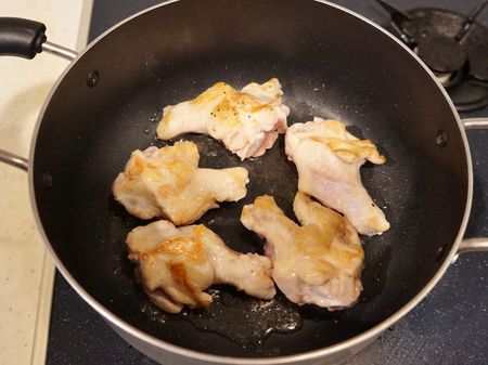 鶏手羽元は骨に沿って包丁で浅く切り込みを入れ、塩とこしょうをまぶします。鍋にサラダ油をひいて中火で熱し、鶏手羽元を入れてあまり動かさずにこんがりと色がつくまで焼きます。