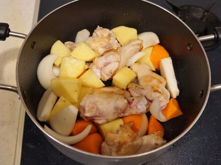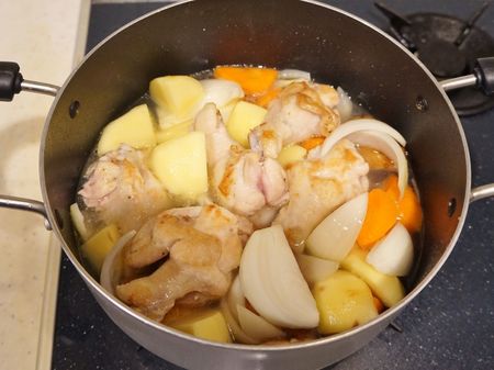 鶏手羽元の表面に焼き色がついたら、じゃがいも、玉ねぎ、にんじんを加えて全体に油が回るまで炒めます。