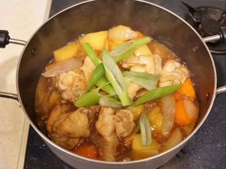 しょうゆを加えてさらに6分ほど煮ます。仕上げに長ねぎの青い部分を加えてひと煮したら器に盛りつけて完成です。